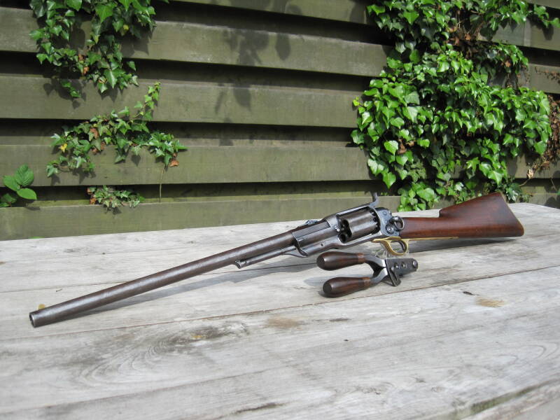 In November last year, this 'Antique Colt revolving Carbine' (serial 11942) was stolen during a burglary in a house in France. Any information regarding this weapon is welcome. The serial number and description are known. It is also known to Interpol, French, German and Dutch police and judiciary. Buying this stolen weapon is a serious crime.