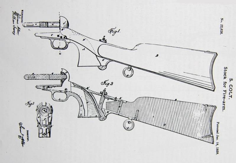 First Patent drawning, No 22626 Stock for Fire-arm, Patented Jan. 18, 1859, 51 Colt Navies, N.L. Swayze