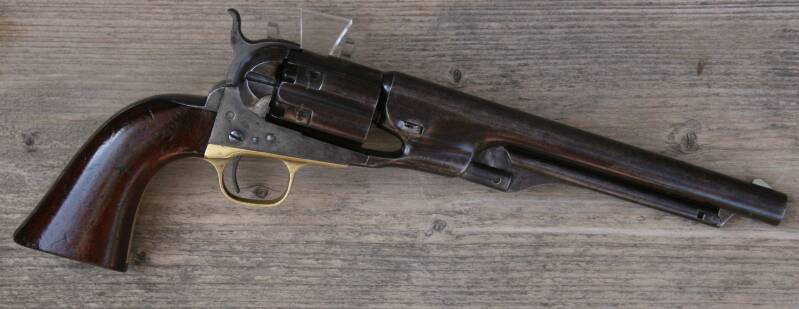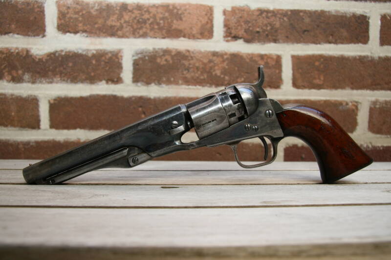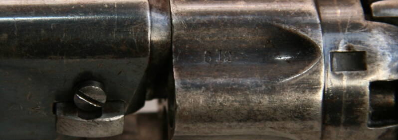 Condition is fine, 100% matching numbers including the cylinder, wedge, grip, and arbor pin. Barrel and cylinder has deep brown and darkening patina with traces of original Army blue finish visible in the rebated areas of the cylinder, cylinder flutes, and in the protected areas of the barrel and back strap. Grip is in Fine condition, retains about all of its orig oil finish. The trigger guard and back strap have never seen silver plating. The Navy ordered only a few hundred of these fluted Army models early in the war and most are believed to have been issued to the ships of the blockade. Mechanical excellent. Collection MS Antique Firearms