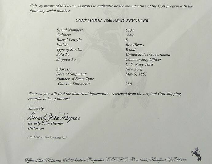 This is an exceptionally nice example of the early Colt 1860 Army Revolver with 4-screw frame, 8" inch barrel, with the desirable full fluted cylinder. The Revolver is sold to the United States Government, Commanding Officer, U.S. Navy Yard, New York, May 9, 1861.