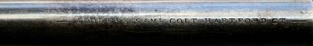 The Revolver has SN 79xxx. Its a early Navy with a small round triggerguard, 7-1/2” barrel with the standard pin front sight, 1-line Hartford address with dashes, 4-screw frame cut for shoulder stock with extended 4th screw. It has silver plated iron grip frame with small triggerguard and the rare feature of a swivel in front of the triggerguard. It has 1-pc walnut grip. Cylinder and left side of the barrel lug have British proofs.