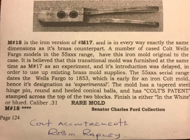 This is a very scarce mold listed as for the Wells Fargo and possibly experimental. Front is marked Colts Patent and a small W. Cavities are excellent.