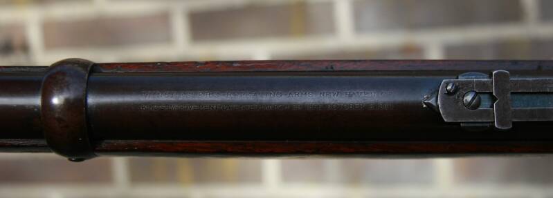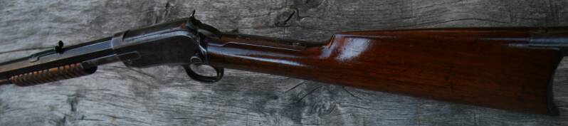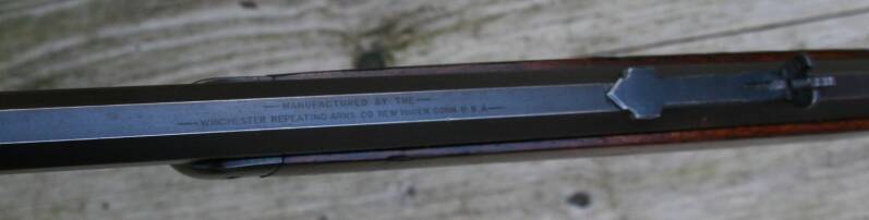 This rifle is a standard configuration with a 24 inch octagon barrel chambered in 22 SHORT caliber, serial 38xxx, in exceptional condition given its age, made in 1896, with a excellent bore! Original sights. Barrel shows most original blue starting to brown with scattered light handling marks and a freckle here and there. Both sides of frame has some traces of original blue, especially in the protected areas. Magazine tube finish has started to turn brown with more blue in protected areas. Walnut stock is in very fine and untouched condition, never been sanded, no cracks or goughes. Crescent buttplate. Crisp tight action.