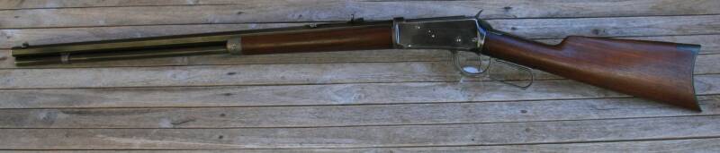 WINCHESTER 1894 RIFLE IN CALIBER 38-55; Original sights on the 26 inch octagon barrel. Full length mag tube. Rifle style buttplate. Overall metal has about 25-30% blue remaining turning a plum color. Traces of case colors on the hammer and lever. 75xxx serial range. Wood is sound and solid with just a few light mars and dings. Bore has sharp rifling and would benefit from a good cleaning. This very nice rifle has been very well maintained and preserved in fine condition. this is a better than average model 1894. Pretty decent looking gun!