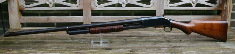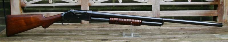 The Winchester Model 1893 Slide Action Shotgun was designed and patented by the Browning Brothers, and was the first successful slide-action shotgun. It was introduced in May of 1893, and was manufactured until July of 1897. It was made in 12 Gauge only, and with a 2-5/8” chamber only, with 30” and 32” rolled steel Full choke barrels as standard.